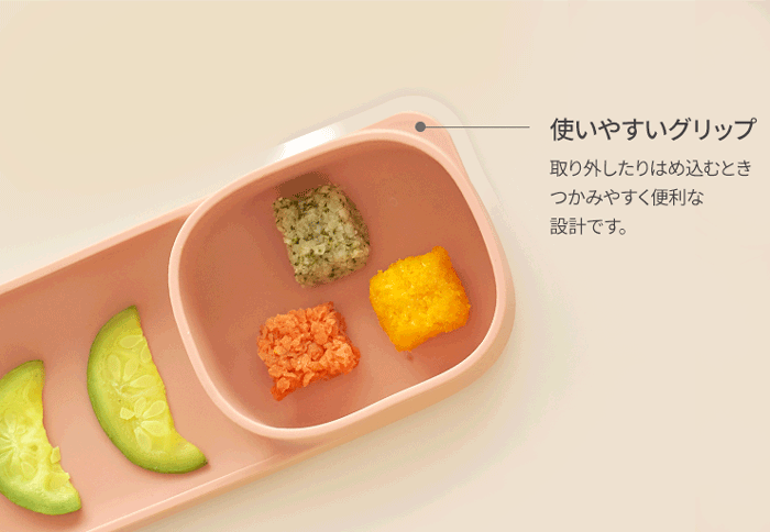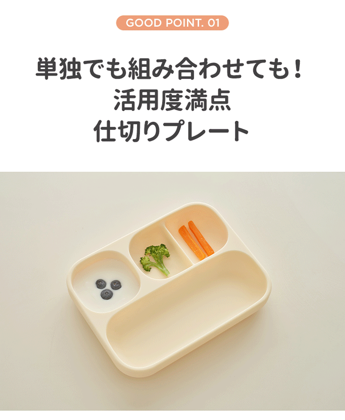 シリコン仕切りプレートは、そのまま使うのはもちろんですが、別売りのシリコンプレートの仕切りとしても使えます。 ●お手入れ簡単! 電子レンジ・食洗機・煮沸OK ●プレートの角は丸いのでカーブを利用してスプーンですくいやすい ●深さも3.5cmあるのでスープなどの汁物やドロドロ期の離乳食にも使用可能